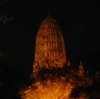 Outside of Bangkok there is lots to see. We made a day trip to the historic town of Ayuthaya which is about 70 km to the north of Bangkok. Ayuthaya used to be capitol of Thailand 400 years ago before it was destroyed by the Burmese. There are some amazing temples and palace ruins there. Our friend Vivorn dropped us off on the outskirts of the city in the late afternoon for a little exploring. To our dismay, the first site we tried to visit has just been closed for the day. Essentially we were stranded in the middle of the Thai countryside without any real way of communicating. So we walked towards the modern day town center where there was a great little night market that had just started. There were little stands everywhere with local goods, fruits and vegetables, watches, VCD’s … We must have been the only westerners there. David towers over the Thai people at over 6 feet and we got a few long stares. We finally figured out where we could find a tuk tuk to take us into the old city ruins. What we didn’t realize was that we had another 25 km to go and that our driver who spoke minimal English had no real idea where we wanted to go. It made for a long ride through the Thai countryside passing rice paddies and small local temples. So we made a pit stop to consult with our driver by using the Lonely Planet I had brought along to point out where we wanted to go. Since he was still a bit confused, he stopped to discuss the problem with a local shopkeeper. Finally, just as the sun was beginning to set, we arrived at our destination.