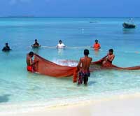 The Maldivians really depend on the ocean to supply most of their food. One day while we were on the beach, we saw a large group of Maldivian men wading in the shallow water and holding nets. The water had almost a frothed appearance from a large school of fish being brought in. Occasionally, one of the men would toss a fish like it was a football right on to beach where it would flop around for a few seconds. They must have caught about 500 fish that day. According to one of the officials there, all this fish would feed the island of Uligan for a good month. It was definitely the high point of the day for the village. Many of the women and children came out to watch the catch.